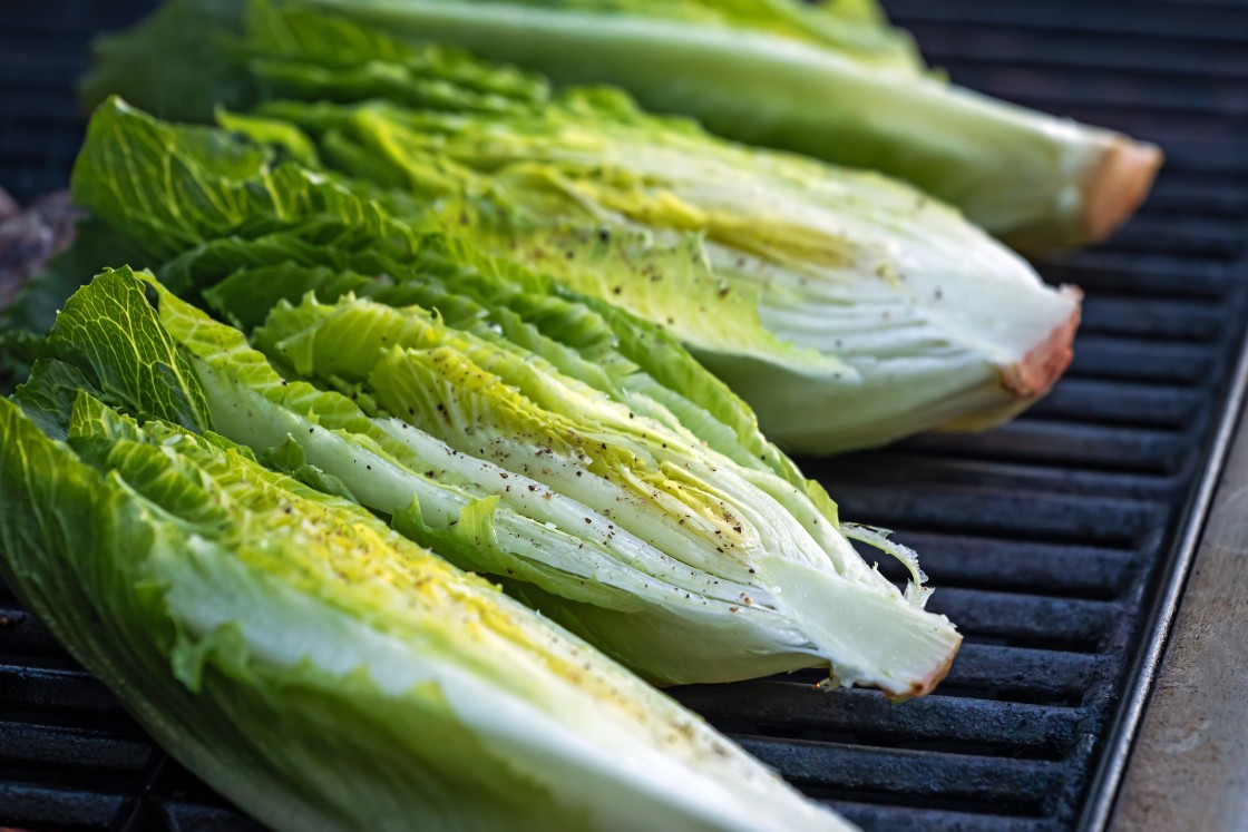 - Brush the cut sides of the romaine with olive oil. Sprinkle all over generously with salt and pepper. When the grill is hot, reduce the heat to medium. Place the romaine stalks on the grill, cut side down. Grill for 1 to 2 minutes, until the lettuce becomes charred, then flip over and grill for an additional 1 minute. Remove the romaine from the grill.